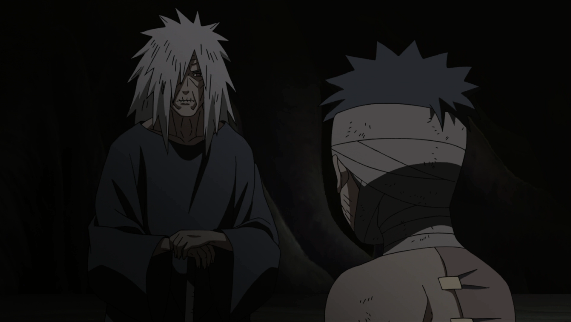 Pada kenyataannya, Obito diselamatkan oleh orang tua bernama Madara Uchiha, yang menemukan Uchiha muda ketika ia membuat terowongan membawanya ke salah satu terowongan yang mengarah kePegunungan Makam. Meskipun Sharingan secara ajaib tidak terluka, seluruh sisi kanan tubuhnya dari bawah leher hancur, mendorong Madara untuk merekonstruksi tubuhnya menggunakan Tubuh Buatan Hashirama,[7] sementara diam-diam menempatkan segel terkutuk di hati Obito untuk membatasi tindakan-tindakan tertentu, seperti bunuh diri. Mengatakan Obito bahwa ia sekarang berutang hidupnya, Obito malah menyatakan bahwa ia ingin kembali ke Konoha dan bersama teman-temannya. Madara memberitahukan bahwa tubuh barunya akan mencegah dia dari menjadi shinobi lagi, dan bahwa pada akhirnya itu tidak masalah. Madara menceramahi tentang sifat keras dari realitas dan bagaimana ia memiliki rencana untuk mengubah dunia. Masih tidak percaya, tetapi sebaliknya tidak dapat meninggalkan tempat, Obito tetap di bawah Pegunungan Makam untuk memulihkan diri. Selama menjalani rehabilitasi untuk menggunakan kaki barunya, ia bertemu dan berteman dengan Zetsu Putih dan Zetsu Spiral yang disebutnya Guruguru.